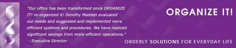 ORGANIZE IT! is a professional organizing service supporting individuals, businesses, and residential clients to organize their lives, homes, offices, and companies. Dorothy Madden, professional organizer, offers individual consultations and training, hands-on organizing, and on-going coaching.